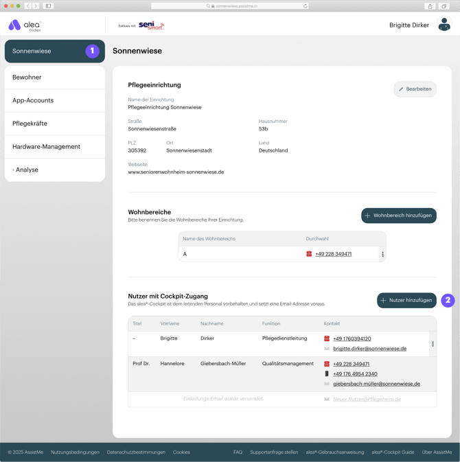 Weitere alea-Cockpit Accounts können im alea-Cockpit erstellt werden – dazu im Pflegeeinrichtungs-Tab (1) auf den Button “Nutzer hinzufügen” (2) klicken.
