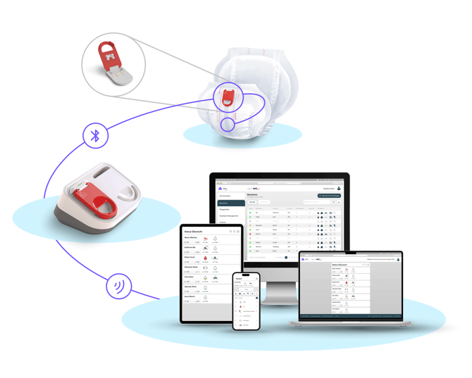 Die Funktionen (Inkontinenzmonitoring, Erkennung der Körperposition, Sturzerkennung, Sicherer Bereich) sind in der alea-App für Pflegende sowie im alea-Cockpit für leitende Pflegeverantwortliche verfügbar – in häuslichen und betreuten Wohnumgebungen.
